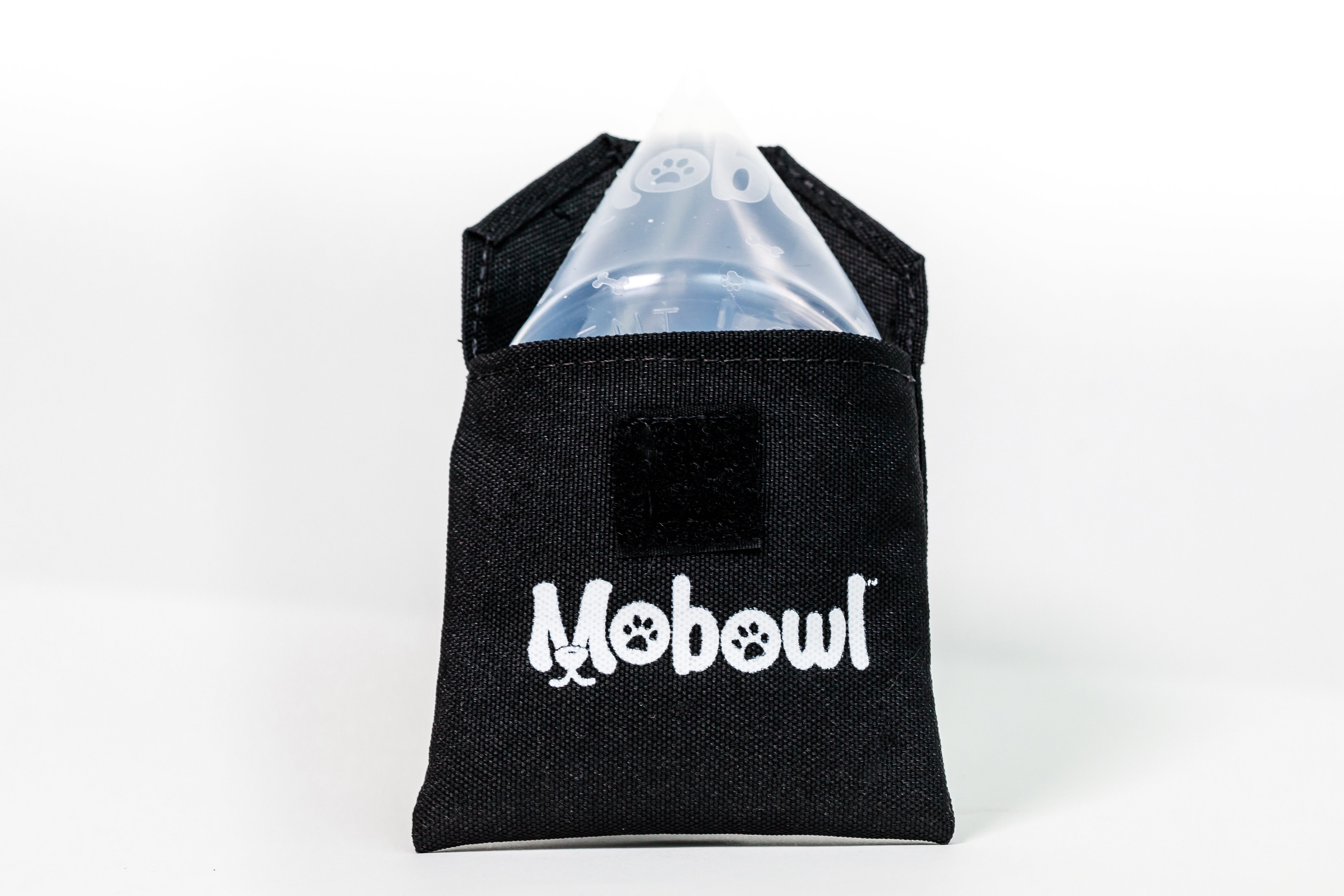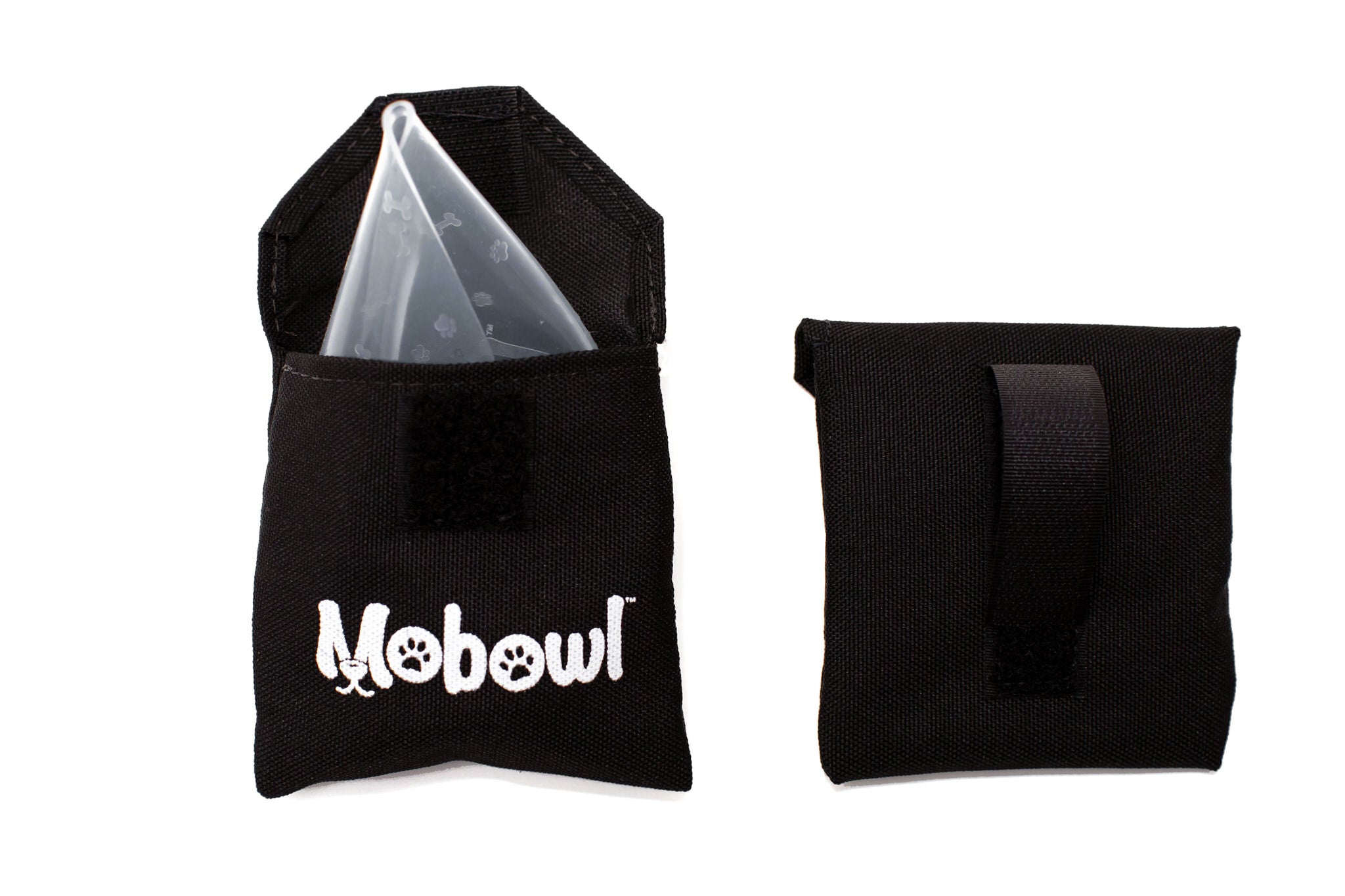The Mobowl® pet bowl with carrying pouch. This convenient 4” in diameter bowl holds 2 cups of water or food and is the perfect size for most all dog and cat breeds.